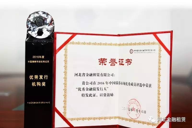 日前,中央國債登記結(jié)算有限責(zé)任公司發(fā)布2016年度中國債券市場優(yōu)秀成員評(píng)選結(jié)果,河北省金融租賃有限公司被評(píng)為“2016年度全國金融債優(yōu)秀發(fā)行人”,進(jìn)一步彰顯了河北金租的品牌和市場影響力。