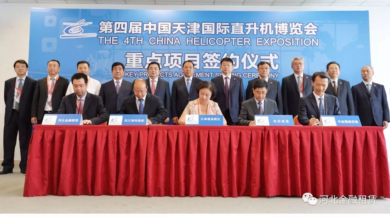 本屆中國天津國際直升機博覽會簽約重點項目涵蓋航空產業發展多個領域,天津濱海新區區委副書記、區長楊茂榮出席項目簽約儀式,河北金租租賃事業部總經理吳楊代表公司與天津空港經濟區保稅區管委會簽署《飛機租賃項目投資協議》,河北金租董事長徐敏俊見證了項目簽約。