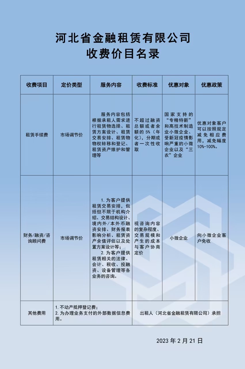 河北省金融租賃有限公司收費價目名錄