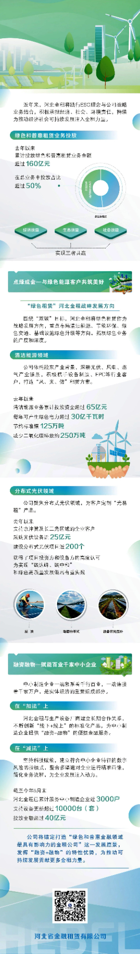 圍繞“雙碳”目標,河北金租將綠色租賃作為戰略發展方向,重點布局清潔能源、節能環保、綠色交通、基礎設施綠色升級等方向,拓展綠色業務的廣度和深度。